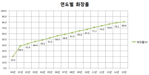 이는 1994년도 화장률 20.5%에 비해 약 4배 증가한 수치이다. 우리나라 화장률은 2005년 52.6%로 매장률을 넘어선 이후 2011년 70%를 돌파한데 이어 4년 만에 80%를 넘어섰다.