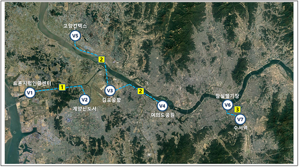 이어 한강 노선(김포공항∼여의도공원∼고양 킨텍스)에서 2단계 실증이 진행된다. 2025년 4월부터 한 달간 공항 지역과 한강회랑에서 실증이 이뤄질 예정이다.