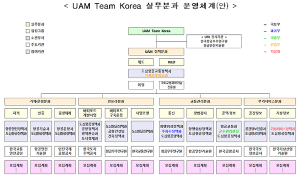 또 국토부는 이날 회의에서 오는 2025년 말 상용화를 본격 준비하기 위해 UAM 팀코리아를 정책, 기체·운항, 인프라, 교통관리, 부가서비스 등 5개 실무분과 체제로 구축하기로 했다.