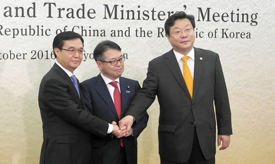 한·일·중 3국 경제통상장관은 29일 일본 도쿄에서 열린 제11회 한·일·중 경제·통상장관회의에서 자유무역 기조를 흔들림 없이 추진하고 보호무역주의 문제에 공동 대응키로 합의했다.