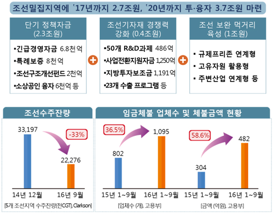 이를 위해 조선업의 침체로 조선 수주잔량 하락, 임금체불 급증 등 경기 위축이 가시화되고 있는 5개 권역에 내년 중 2조 7000억원을 지원하기로 했다.