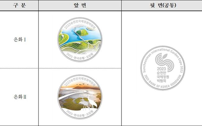은화Ⅰ 앞면은 박람회의 대표 정원인 호수정원의 전경을 묘사했으며, 은화Ⅱ 앞면은 노을 지는 순천만 습지와 순천시의 시조(市鳥)인 흑두루미를 표현했다.