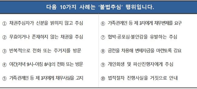 아울러 위반업체나 불법 채권 추심자에 대해서는 수사 의뢰 등 강력한 조치도 내릴 예정이라고 덧붙였다.
