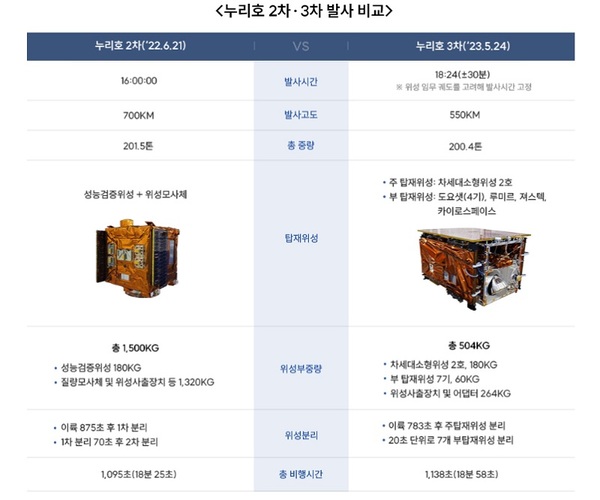 ▲ 누리호 2차·3차 발사 비교(자료=한국항공우주연구원)누리호 발사 후 1183초만에 성공 판가름 난다