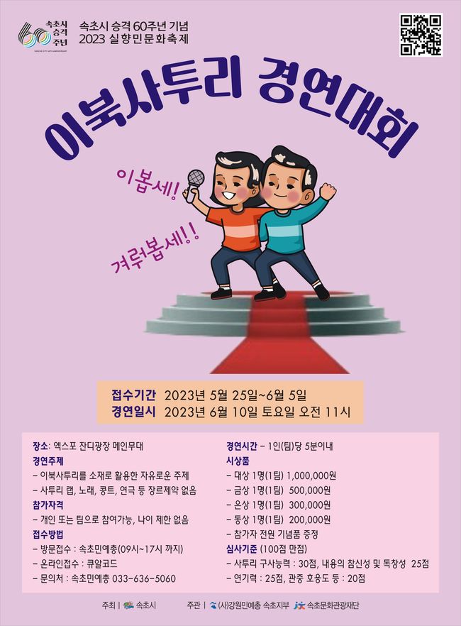대회 참가 신청은 6월 5일(월)까지 속초민예총 사무실로 방문 접수(9시부터 17시까지) 또는 행사 포스터 내 QR코드로 신청 가능하며, 신청자가 많을 경우 예선을 따로 진행할 예정이다.