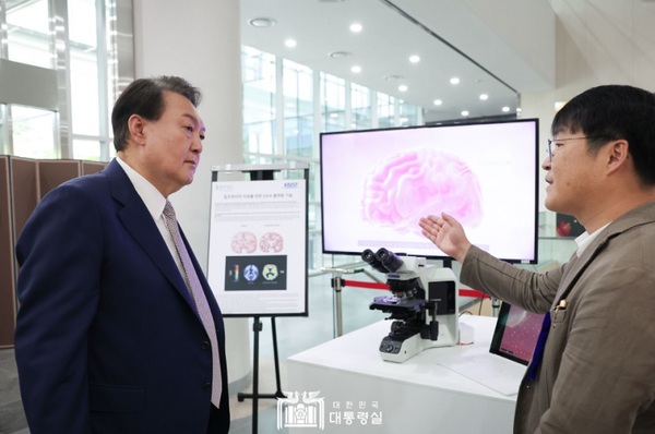 ▲ 윤석열 대통령이 1일 서울 강서구 서울창업허브 엠플러스에서 열린 제5차 수출전략회의에 앞서 KAIST 김찬혁 교수로부터 알츠하이머 단백질 치료제에 대한 설명을 듣고 있다.(대통령실 제공)이번 회의는 지난 4월 미국 국빈 방문시 보스턴 클러스터에 대해 현장에서 토론한 내용을 토대로 한국형 클러스터 육성 전략을 논의하기 위해 마련됐다.