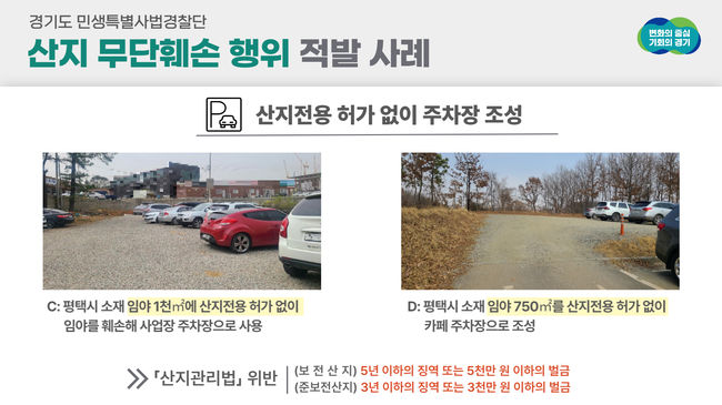 경기도 특사경, 축구장 1.5배 규모 산지에 주차장과 창고 등 무단훼손 20건 적발