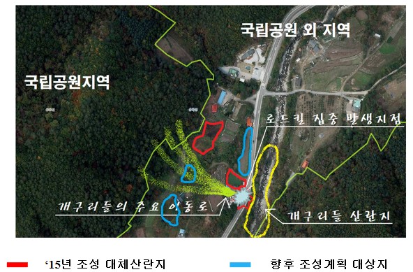 지난해 말에는 국립공원 내 관통도로 41개 노선의 로드킬 빈발구간에 대한 분석을 완료하여, 아이나비 등 차량탑재형 내비게이션에 로드킬 주의 안내 정보를 제공하고 있다.