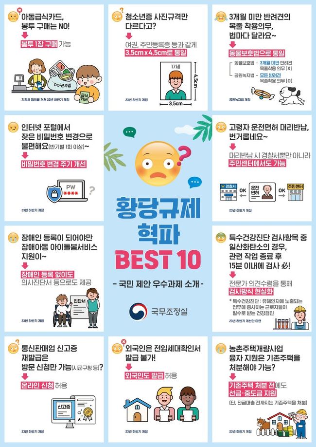 [일간환경연합 장민주 기자] 국무조정실은 국민의 눈높이에서 실생활과 밀접한 규제를 적극 개선하기 위해 ‘황당규제 공모전’을 실시하였으며, 소관 부처 검토 및 국조실 조정, 규제개혁위원회 심의를 거쳐 우수제안과제 10개를 선정했다고 밝혔다.