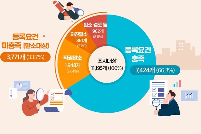 조사대상 11,195개 단체 중 7,424개(66.3%) 단체는 등록요건을 갖추고 운영하고 있음을 확인했다.