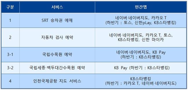 [일간환경연합 신상미 기자] 그동안 공공 웹사이트나 앱에서만 가능했던 SRT 승차권 예매, 자동차 검사 예약, 수목원 예약, 인천국제공항 지도 서비스 등 공공서비스 4종을 6월 27일부터 평소 친숙하고 편리한 민간앱에서 신청‧이용할 수 있게 된다.