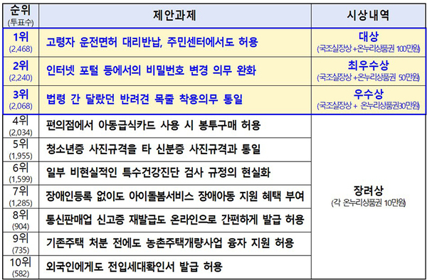 이번 공모전은 일상생활 속 황당한 규제와 개선방안을 국민이 직접 제안하는 방식으로 진행했으며, 전문가 검토 및 규제개혁위원회 심의를 통해 선정한 10개 우수제안과제에 대해 온라인 투표를 거쳐 10위까지 확정했다.