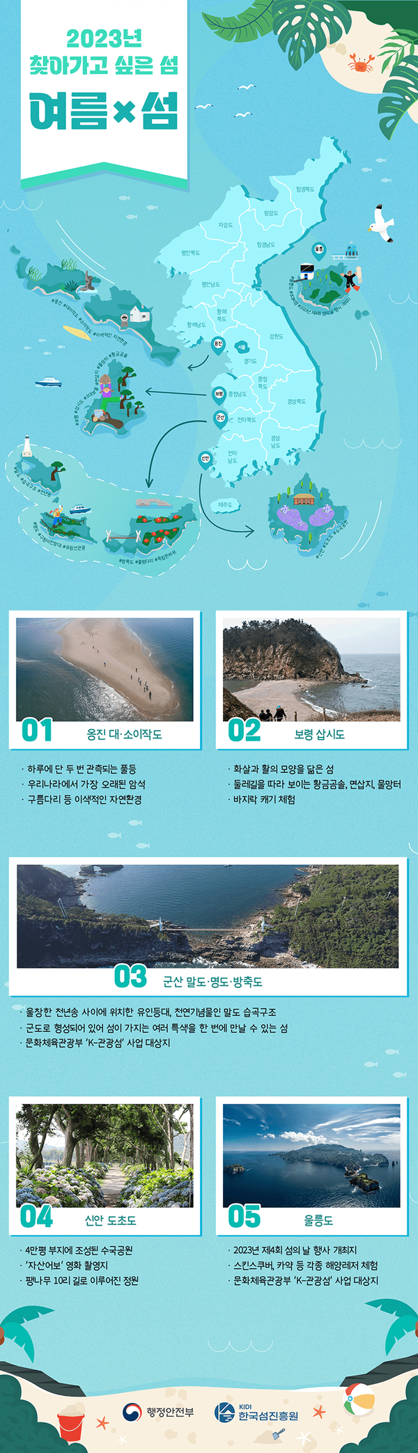 [일간환경연합 장민주 기자]다음은 여름 섬을 소개하겠습니다.2023 찾아가고 싶은 여름 섬 5곳입니다 한눈에 확인해 보세요!