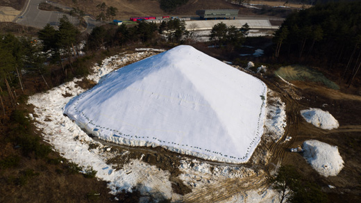 이는 전체 코스에 눈을 덮는데 필요한 1만500㎥의 60% 정도에 해당하는 규모다. 조직위는 지난 3월, 알펜시아 스포츠파크와 용평리조트 내에 각각 1만3000㎥ 규모의 눈을 저장했으며, 11월 현재 각각 50%와 30%가 남아있다.