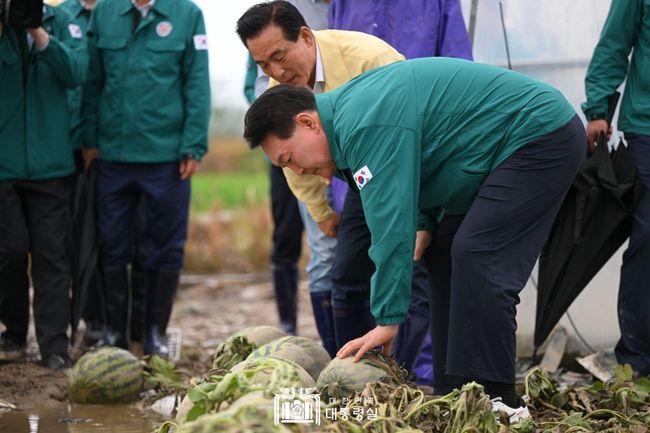 윤 대통령은 먼저 이번 호우로 물에 잠긴 수박 재배농가를 방문했다. 백성현 논산시장은 대통령에게 "이 지역은 논산천과 금강천에 인접한 저지대로 인근 둑이 무너져 수박 비닐하우스가 완전히 잠겼다"며 상황을 보고했다.