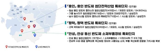 국가첨단전략산업 특화단지 반도체 분야에 지정된 곳은 ▲용인 남사 첨단시스템 반도체클러스터(삼성전자) ▲용인 원삼 반도체클러스터(SK하이닉스) ▲용인 기흥 농서지구(삼성전자) ▲평택 고덕 국제화계획지구 일반산업단지(삼성전자) 4개 단지로 총면적 1,633만㎡에 이른다.