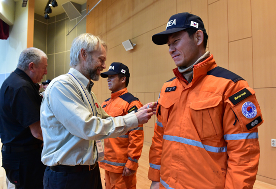| ‘대한민국 해외긴급구호대 구조팀’이 유엔 국제탐색구조자문단이 주관한 인증평가에서 최상급(Heavy) 등급을 획득했다고 18일 외교부와 국민안전처가 전했다. 사진은 헤비등급 패치 수여식. (사진=국민안전처) |