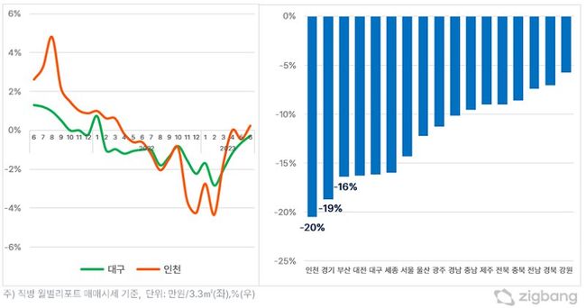 인천은 최고점을 찍었던 2022년 3월 대비 20% 하락했고, 대구는 2022년 1월 대비 17%, 경기는 2022년 3월 대비 16% 순으로 하락했다.