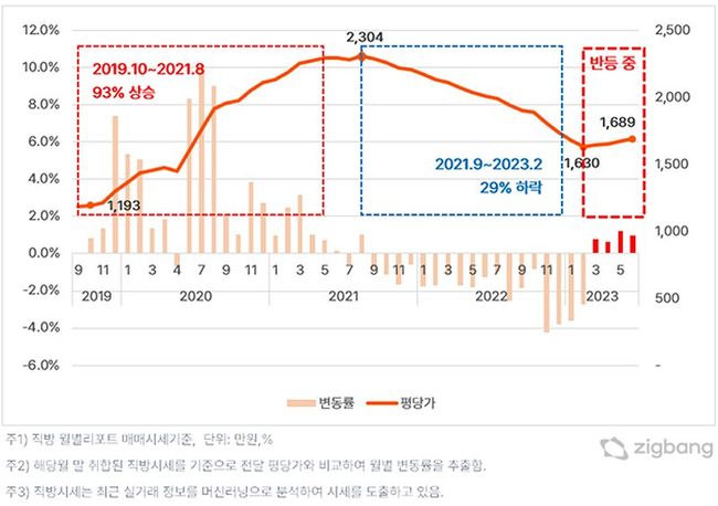 직방 관계자는 "최근 실시한 2023년 하반기 주택 매매가격 전망 설문조사(23.6.14~23.6.30 조사 진행)에 따르면 응답자의 45.9%가 하락할 것으로 응답했다"면서, "약 절반이 하락을 예상했지만 지난 해 말 실시했던 2023년 주택매매가격 전망 설문에서 응답자의 77.7%가 하락을 예상했던 것에 비해 하락 전망 응답자 비중이 다소 감소해 시장 분위기가 달라졌음을 느끼게 한다"고 말했다.