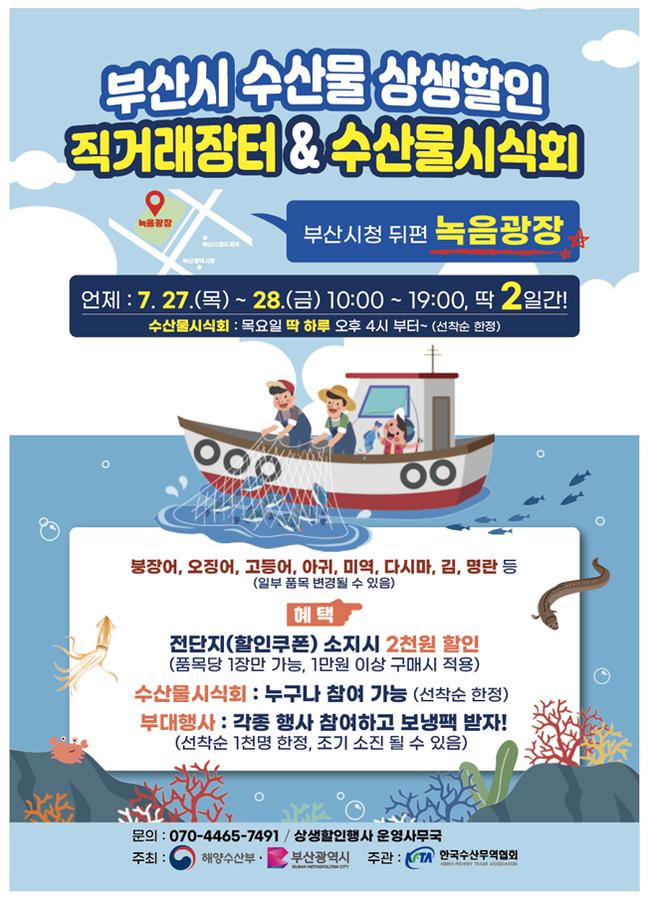 부산시는 오는 27일과 28일 오전 10시부터 오후 7시까지 시청 녹음광장에서 `수산물 상생할인 직거래장터`를 개최한다고 밝혔다.