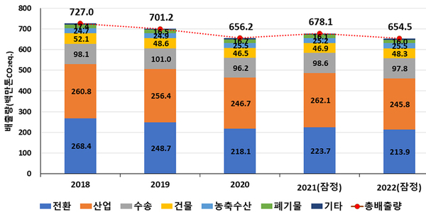 ▲ 부문별 온실가스 배출량추이(’18년~’22년)2022년 국가 온실가스 잠정배출량은 6억 5450만 톤으로 나타났다.