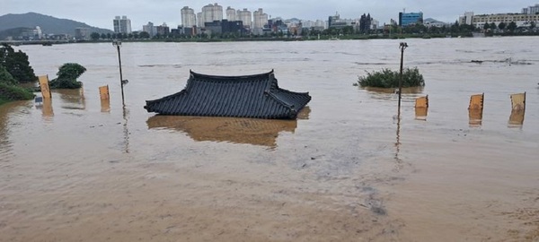 ▲ 유네스코 세계문화유산인 충남 공주 공산성 만하루가 집중호우로 물에 잠겨 있는 모습. ( 사진=문화재청)이에 따라 문화재청은 선제적으로 기후위기 대응 역량을 강화한다. 국가유산 기후변화 피해 데이터 정보체계·빅데이터를 구축하고, 기후변화 영향의 과학적 분석·예측·평가 체계를 마련한다.