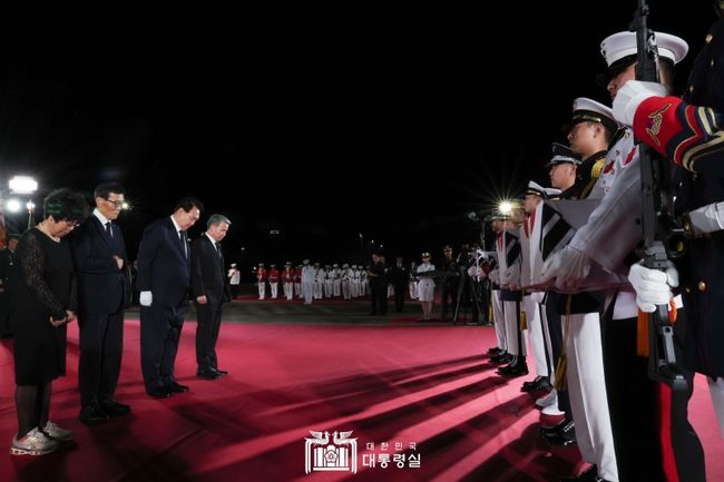윤 대통령은 이날 밤 경기도 성남 서울공항에서 유해봉환식에 참석했다. 특별수송기 앞에 도열해 유해가 조국의 땅에 첫발을 내디딜 때, 예포 21발과 함께 거수경례로 예우를 표했다.