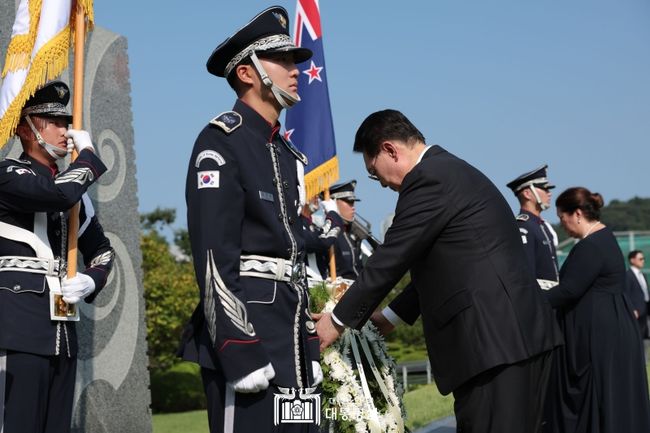 앞서 윤 대통령은 이날 오후 부산 유엔기념공원을 찾아 데임 신디 키로 뉴질랜드 총독 부부, 자비에 베텔 룩셈부르크 총리 등 유엔 참전국 정부대표단과 함께 유엔기념공원 내 상징구역에 있는 룩셈부르크 국기, 뉴질랜드 기념비, 영국군 전사자 묘역 및 유엔군 위령탑을 참배했다.
