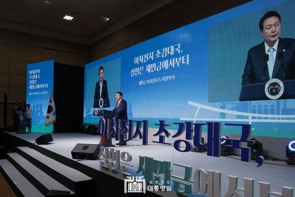 ▲ 윤석열 대통령은 지난 8월2일 오후 전북 군산새만금컨벤션센터(GSCO)에서 열린 `새만금 이차전지 투자협약식`에 참석했다.이번 행사는 LS그룹이 새만금 국가산업단지에 약 1조 8400억 원 규모의 이차전지 핵심소재 제조시설 건립을 위해 새만금개발청, 전라북도 등 관계기관과 투자협약을 체결하는 행사로 투자기업 임직원들을 포함해 국토교통부 장관, 국회의원, 지역 주민 등 약 200여 명이 참석했다.