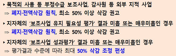 이에 따라 목적외 사용 등 부정수급 보조사업이나 감사원 등 외부 지적 사업은 폐지·전액삭감을 원칙으로 최소 50% 이상 삭감을 권고한다.