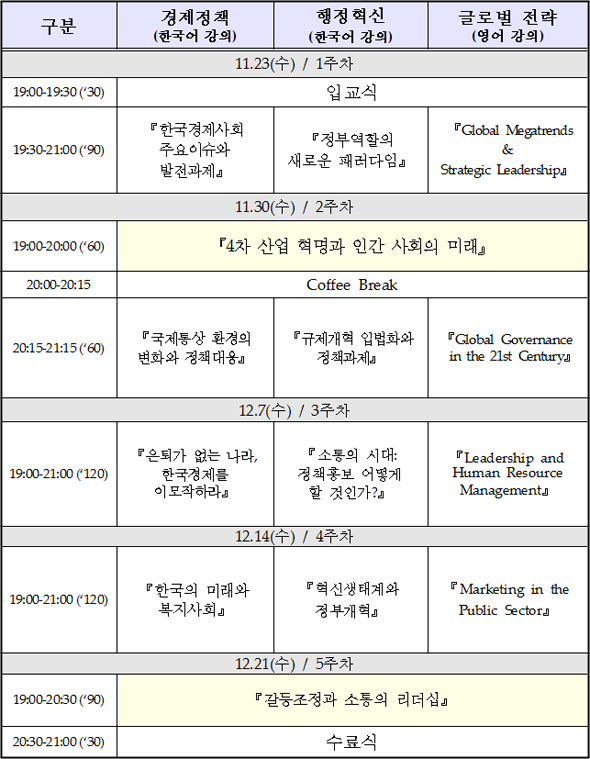매주 수요일 저녁에 진행되는 이번 프로그램은 ‘4차 산업혁명과 인간 사회의 미래’, ‘갈등조정과 소통의 리더십’ 등 2회의 통합 강좌와 경제정책, 행정혁신, 글로벌 전략 등 12회(분야별 4회)의 정책 세미나 등으로 구성됐다.