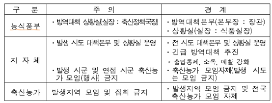 AI 위기 단계가 ‘경계’로 격상하면 AI 긴급행동지침에 따라 전국 시·도(시·군)에 방역대책본부 및 상황실이 확대 설치·운영된다.