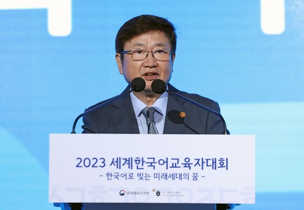 ▲ 박보균 문화체육관광부 장관이 7일 서울 강남구 인터컨티넨탈 서울 코엑스 하모니볼룸에서 열린 2023 세계한국어교육자대회에 참석해 축사를 하고 있다. (사진=문화체육관광부)문체부는 한국어가 문화매력국가의 위상과 브랜드 가치를 높이는 강력한 원동력이 될 수 있도록 한국어 세계화 전략을 짜임새 있게 뒷받침할 방침이다.