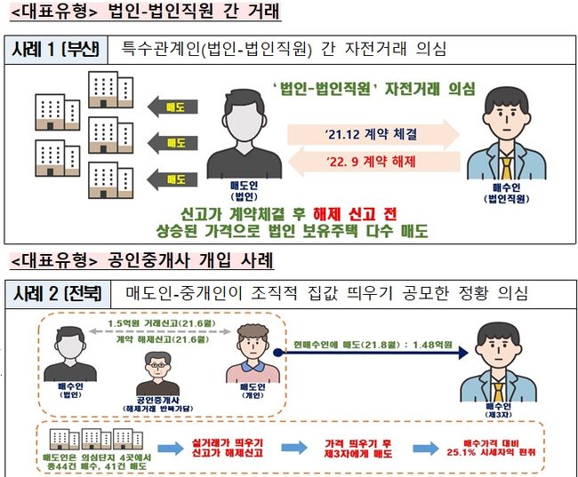 조사 결과 시세조종 목적으로 신(新)고가 신고 후 해제하는 법인-법인대표‧직원 간 거래, 공인중개사 개입 거래 등 다양한 허위신고 의심 거래 유형이 확인되었다.