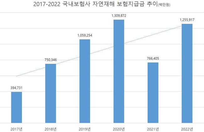 태풍·홍수·호우·강풍·대설·한파 등 자연재해로 인해 국내 보험사들이 2022년 지급한 금액은 1조 2556억원, 지급건수는 39만 6315건이었다. 2017년 지급액은 3947억원, 지급건수는 9만 2537건으로 5년만에 지급액 3.2배, 지급건수는 4.3배로 뛰었다.