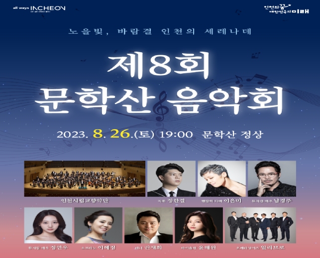 [일간환경연합 김경훈 기자] 인천광역시가 오는 8월 26일 저녁 7시, 문학산 정상에서 ‘노을빛, 바람결 인천의 세레나데’를 주제로 제8회 문학산 음악회를 개최한다고 밝혔다.