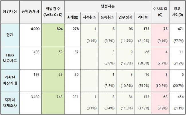 점검 결과, 공인중개사 785명(19%)의 위반행위 824건을 적발하였으며, 관련 법령에 따라 75건을 경찰에 수사 의뢰했고, 자격취소 1건, 등록취소 6건, 업무정지 96건, 과태료 부과 175건의 행정처분(278건)을 진행 중이며, 경미한 사항에 대하여는 점검 현장에서 경고 및 시정(471건) 조치했다.