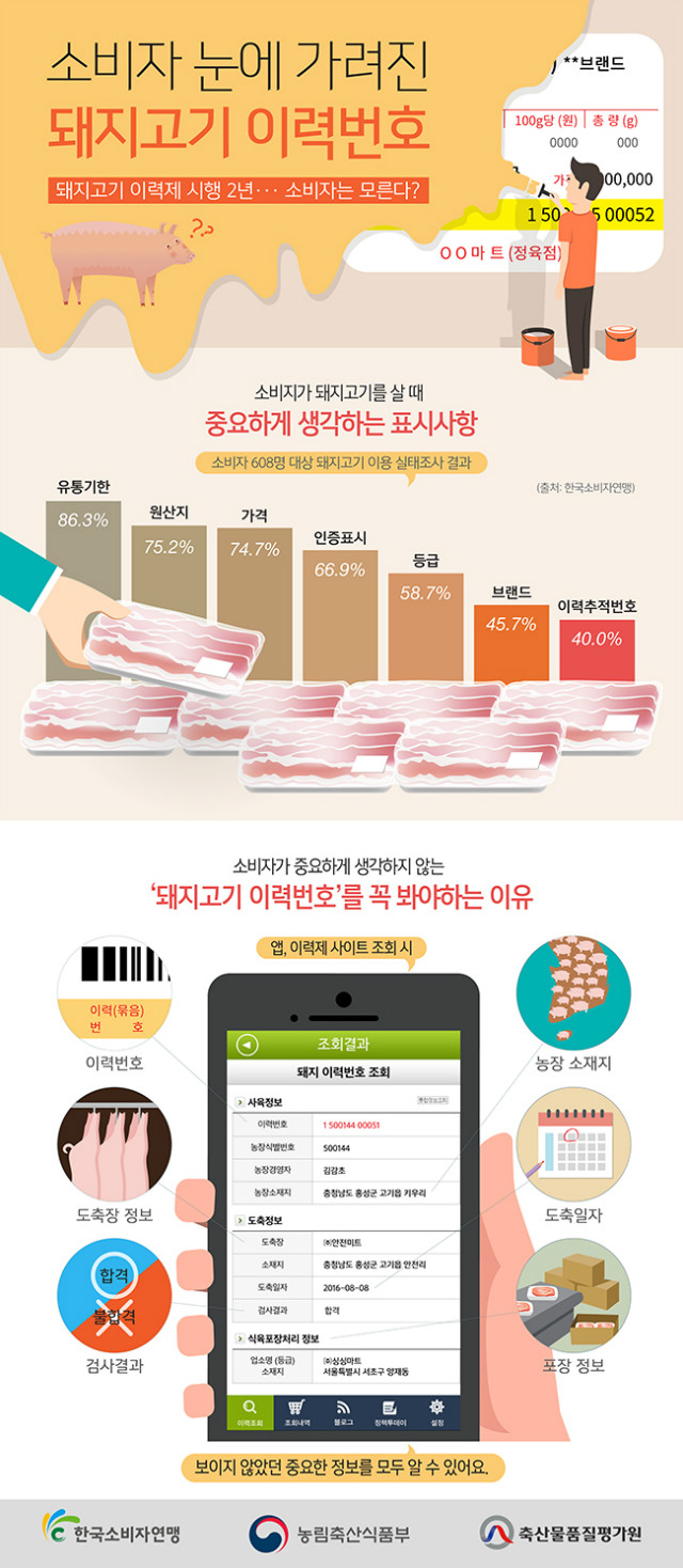 [일간환경연합 신상미 기자]돼지고기 이력제 시행이 2년이 지났습니다. 소비자 눈에 가려진 이력번호를 꼭 봐야 하는 이유. 인포그래픽으로 한눈에 만나 보세요!