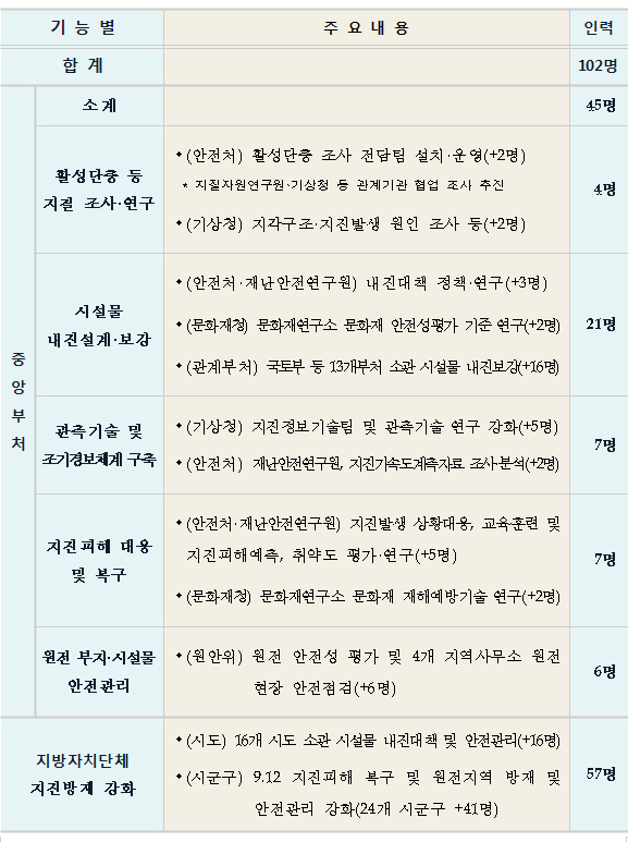 행정자치부는 국민안전처와 기상청의 지진 방재·관측·경보 총괄·연구 기능을 강화하는 등 지진 전담인력 102명을 보강한다고 28일 밝혔다.