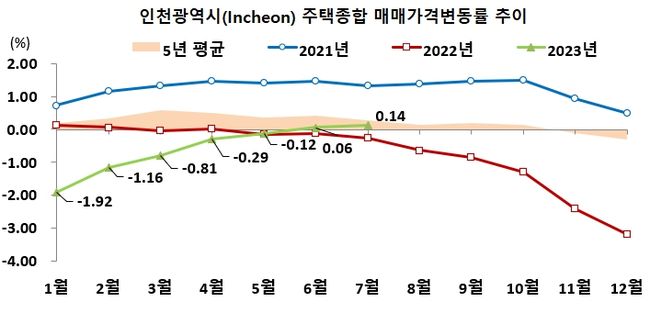 부동산통계에 따르면 전국 주택종합 매매가격지수변동률은 0.03%로 전월대비(-0.05%) 하락에서 상승으로 전환됐으며, 인천시는 0.14%로 전월대비(0.06%) 상승세가 지속되고 있고 전국 평균을 상회했다.