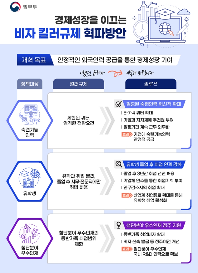 [일간환경연합 장민주 기자] 법무부는 24일 제4차 규제혁신전략회의에서 ‘경제성장을 이끄는 비자 킬러규제 혁파방안’을 발표했다.