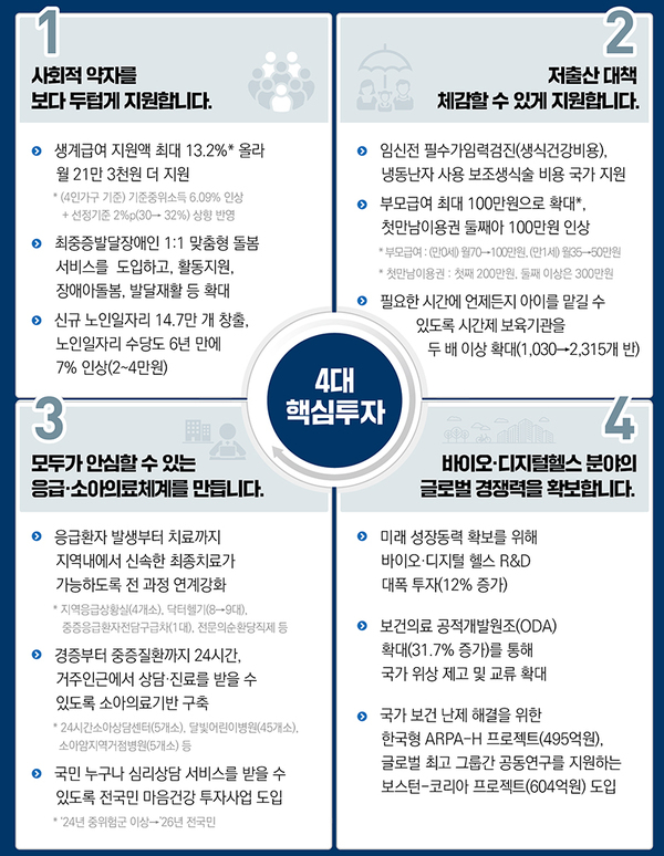 ▲ 2024년 보건복지부 4대 핵심투자대통령은 내년도 총지출을 2005년 이후 가장 낮은 2.8% 증가한 656조 9000억 원으로 잡은 것을 언급하며, “모든 재정사업을 원점에서 재검토해 정치 보조금 예산, 이권 카르텔 예산을 과감하게 삭감했고, 총 23조 원의 지출구조조정을 단행했다”고 평가했다.