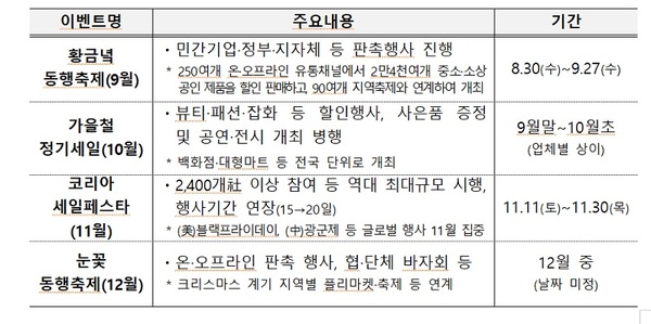 정부는 9월 황금녘 동행 축제, 10월 가을철 정기세일, 11월 코리아세일페스타, 12월 눈꽃 동행축제 등 할인 이벤트를 연달아 개최해 국내 소비도 진작한다.