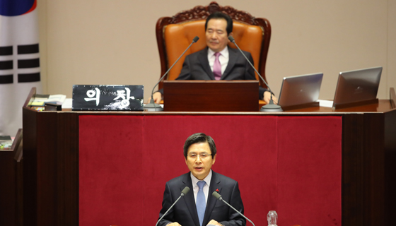 황교안 국무총리가 3일 오전 국회에서 열린 본회의에서 2017년 예산안이 통과된 뒤 인사말을 하고 있다.(사진=연합뉴스 제공)12개 세부분야 가운데 보건·복지·고용(130조원→129조 5000억원), 문화·체육·관광(7조 1000억원→6조 9000억원), 일반·지방행정(63조 9000억원→63조 3000억원) 등 3개 분야 예산은 정부안 대비 줄었다.