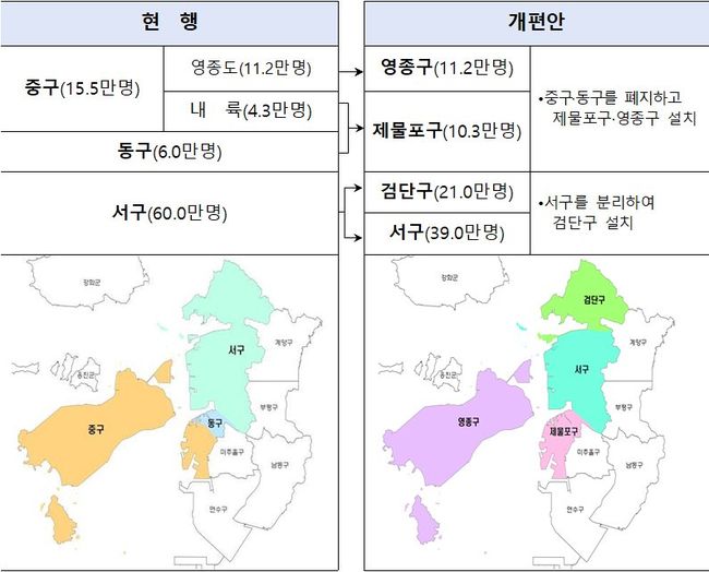 법률안은 ▲중구 내륙 지역과 동구를 관할하는 제물포구 설치 ▲중구 영종도 지역을 관할하는 영종구 설치 ▲서구 아라뱃길 북쪽을 관할하는 검단구 설치 등을 담고 있다.