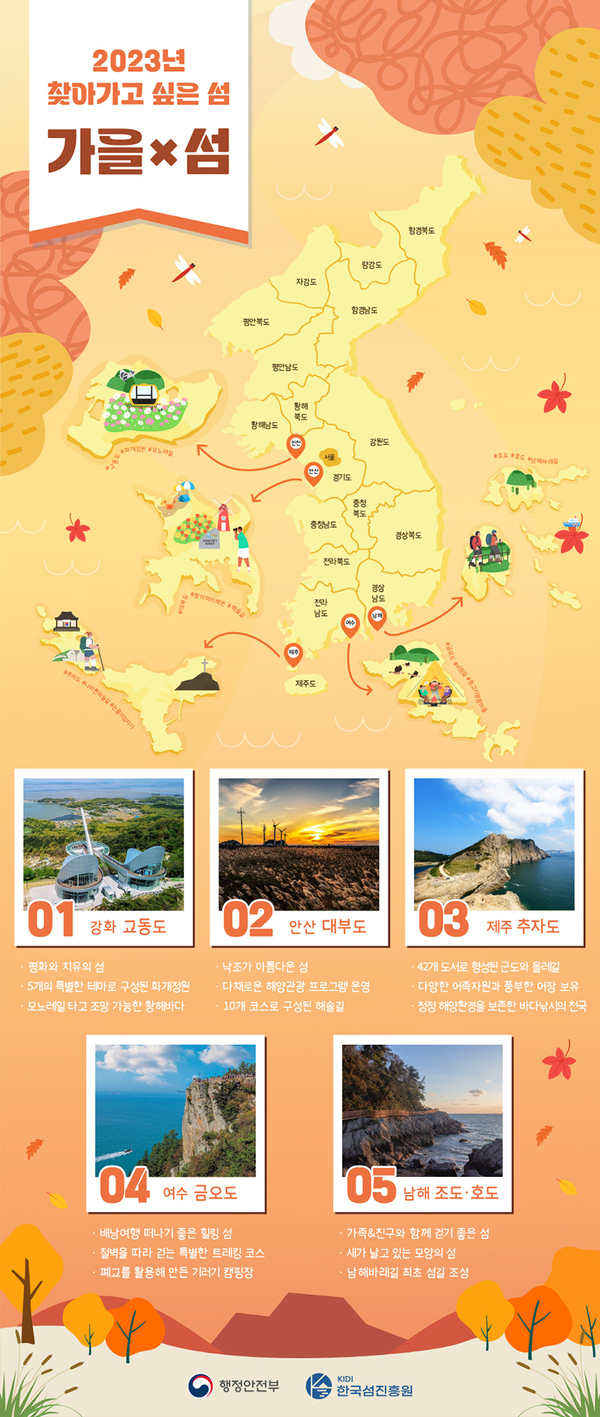 [일간환경연합 한선미 기자]다음은 2023 찾아가고 싶은 섬을 소개하겠습니다. 가을 섬 5곳입니다.인포그래픽뉴스로 한눈에 확인하세요.