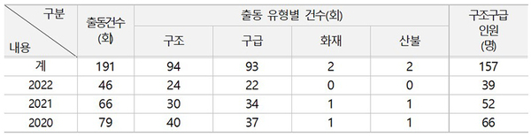 연도별로는 2020년 66명, 2021년 52명, 2022년 39명을 이송했고 2021년과 2020년에는 산불 관련 출동이 각 1건씩 있었는데 대부분은 구조·구급 출동이었던 것으로 분석됐다.
