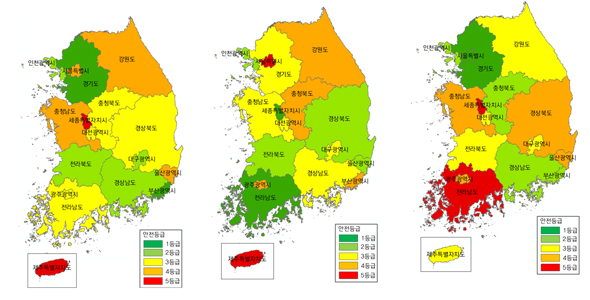 광역지자체 안전사고.범죄.교통분야 안전지수 지도.제주특별자치도도 범죄, 안전사고, 자연재해 분야에서 5등급의 평가를 받았다.