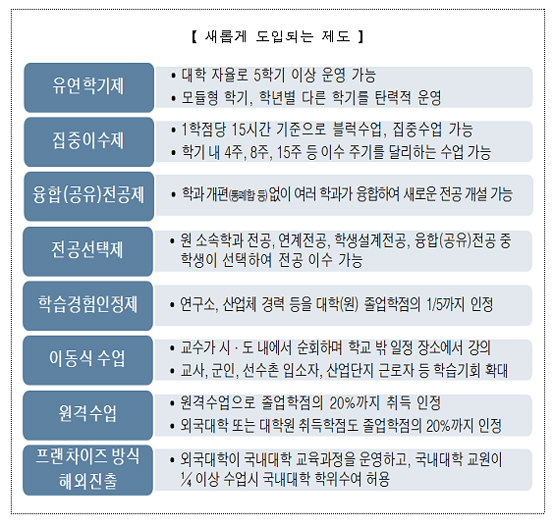 개선안은 우선 현재 대부분의 대학이 ‘1학기-계절수업-2학기-겨울방학’의 형태로 학기를 운영하는 것을 다학기제와 유연학기제를 도입해 현재 2∼4학기만 허용하던 것에서 대학 자율로 5학기 이상, 학년별로 다른 학기제를 운영할 수 있도록 했다.