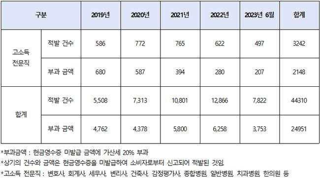 지난 2010년 현금영수증 의무발급 제도가 도입되면서, 고소득 전문직은 10만 원 이상의 금액에 대해서는 의무적으로 현금영수증을 발급해야 하고 미발급 시 미발급 금액의 20%를 가산세로 내야 한다. 그런데 제도가 도입된 지 13년이 지난 지금까지로 의사나 변호사 등 고소득 전문직의 현금영수증 미발급 신고가 국세청에 접수되고 있는 것으로 드러났다.